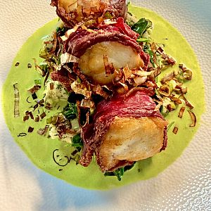 Varkenshaasje - crème van butternut - gebakken appel - rode ui - kriel aardappelen en chorizo